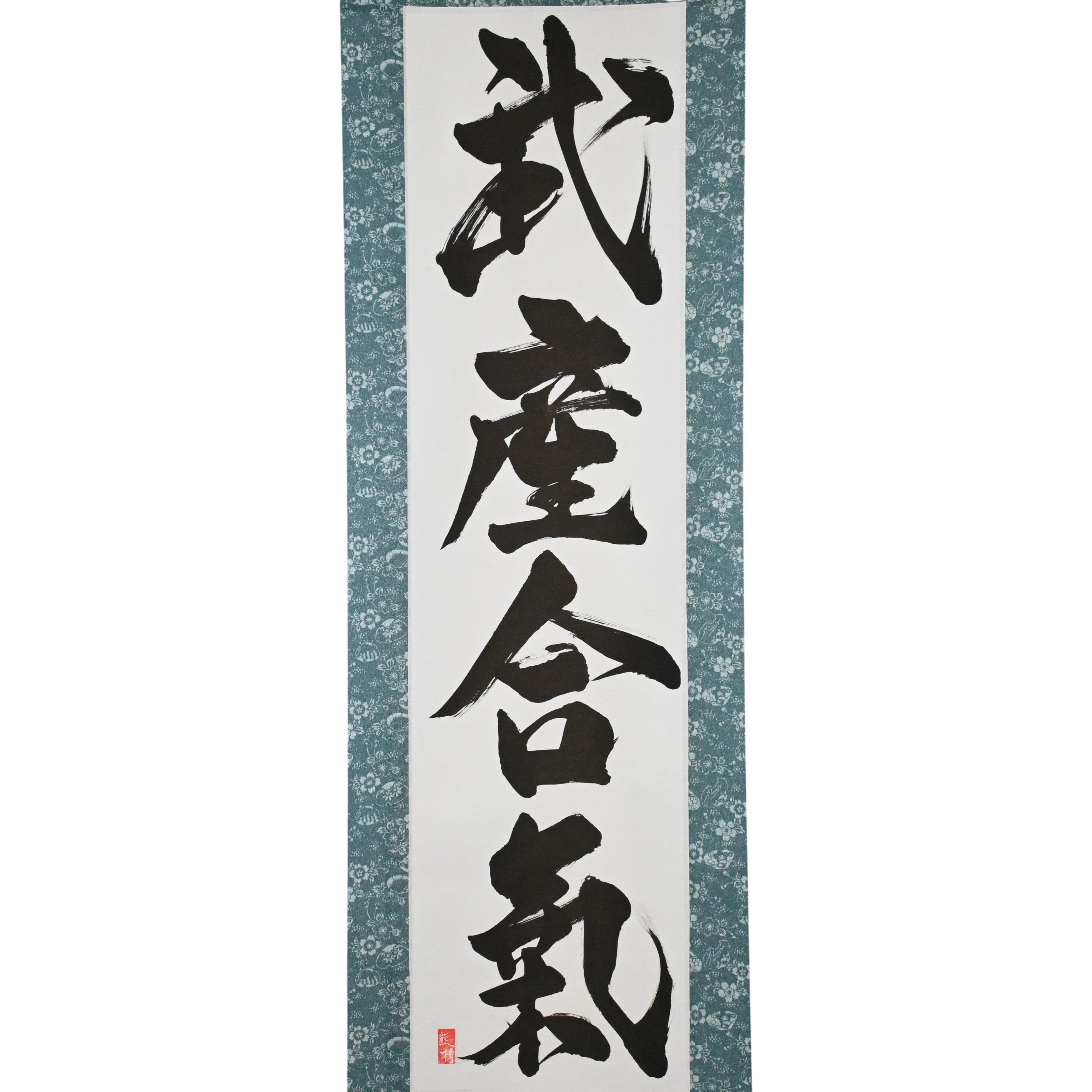 Ce rouleau de calligraphie japonaise présente la phrase profondément spirituelle 武産合気 (Takemusu Aiki) — « la naissance martiale de l'harmonie ». Expression centrale du fondateur de l'Aïkido Morihei Ueshiba (植芝盛平), elle encapsule la réalisation la plus élevée de cet art.